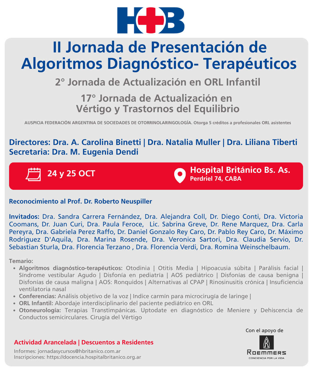 2° Jornada de Actualización en ORL Infantil | 17° Jornada de Actualización en Vértigo y Trastornos del Equilibrio. Actividad presencial dirigida a médicos, médicos ORL y residentes de ORL. Actividad arancelada, cupos limitados.